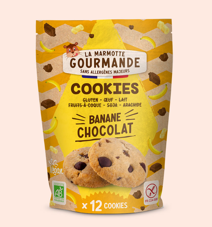 Nuestras galletas sin alérgenos están elaboradas con ingredientes sin gluten y sin los principales alérgenos, cuidadosamente seleccionados para garantizar una experiencia de sabor inolvidable: harina de arroz, aceite de coco, azúcar de caña, almidón de maíz, almidón de yuca… sin olvidar auténticos trozos de plátano y chips de chocolate.